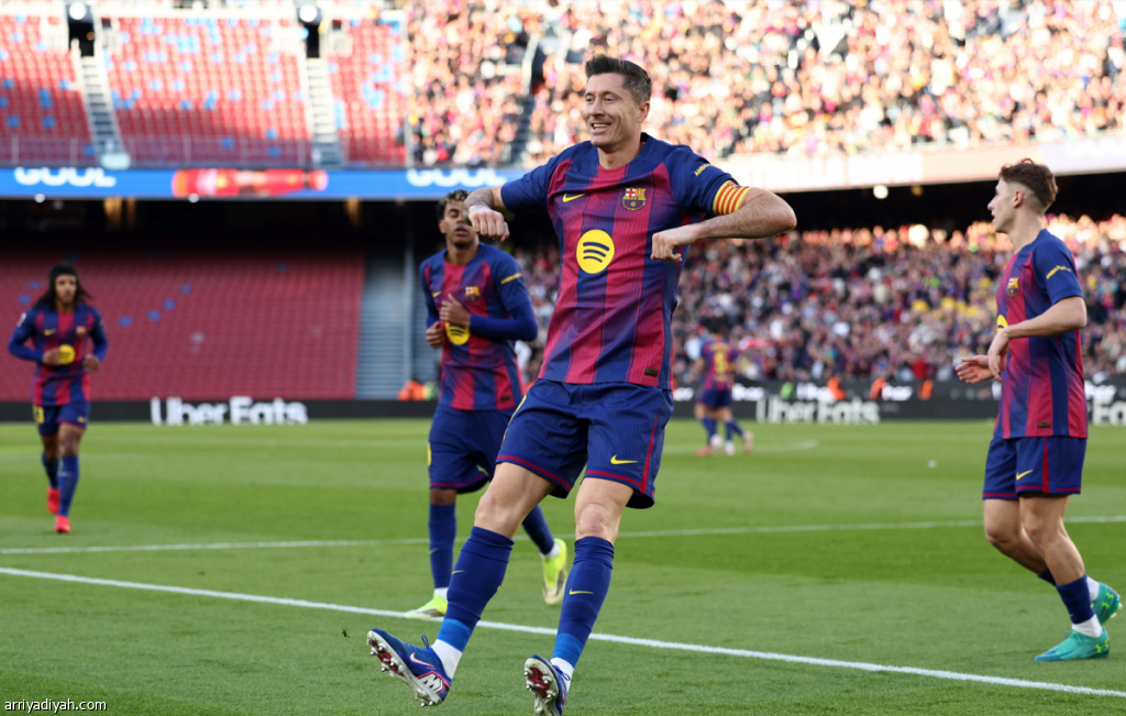 أمَّن فريق برشلونة الإسباني الأول لكرة القدم صدارته لجدول ترتيب الدوري المحلي، وابتعد بفارق أربع نقاط عن ملاحقه وغريمه ريال مدريد، بفوزه السبت عل ريال مايوركا بثلاثية نظيفة لحساب الجولة الـ 23، في مباراة انضم فيها المهاجم البولندي إلى قائمة نادرة من الهدافين.
